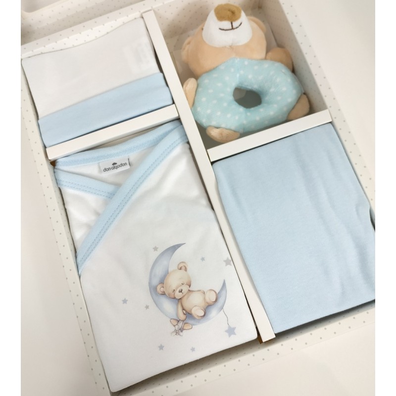 -Conjunto de primera puesta con sonajero en azul y blanco.