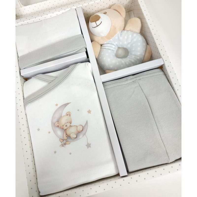 -Conjunto de primera puesta con sonajero en gris y blanco.