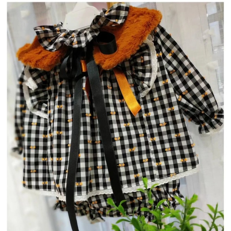 Conjunto de Jesusito y ranita en algodón vichy negro con motas en color ocre.