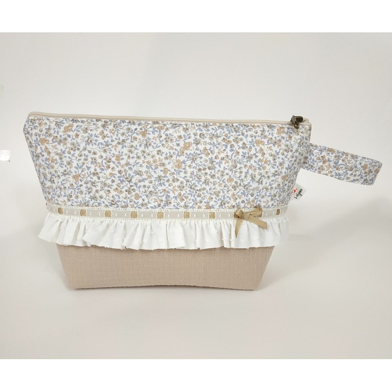 Neceser bicolor en pique camel y estampado de flores en tonos azul y camel.