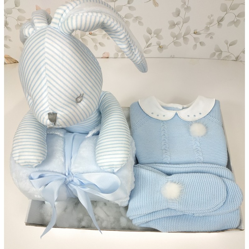 Canastilla primera puesta en celeste con conejito de peluche y manta.