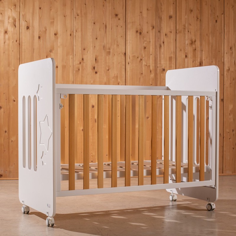 Cuna con barrera abatible en color natural con 4 pies o ruedas ligado a la colección STAR NATURE. Visualiza una estupenda clase con barrotes y pies en color natural, estrellas talladas al cabezal.