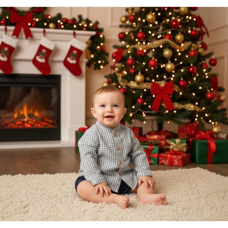 Conjunto de bombacho en pana azul marino y camisa vichy azul grisáceo con cuello mao.
