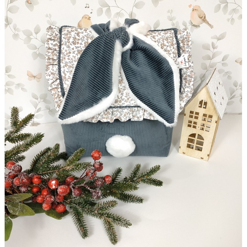 - Mochila con tapa pequeña para guardería o merienda, en pana azul grisáceo combinada con un estampado de florecitas en tonos azules y topo.