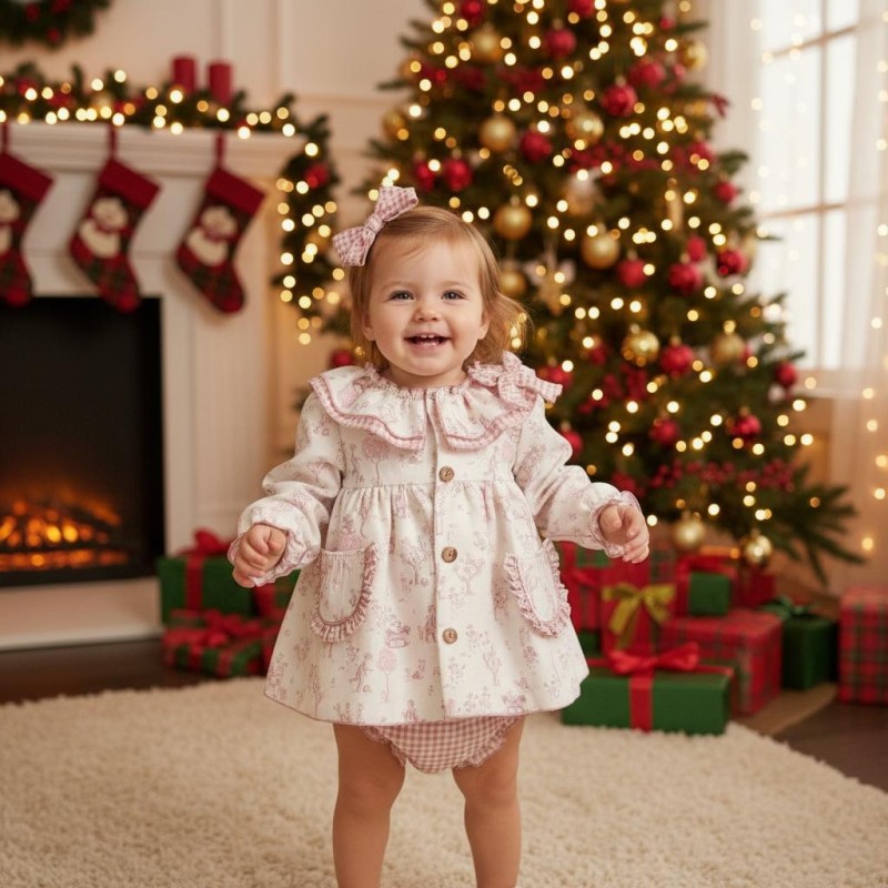 Conjunto de jesusito y ranita en estampado de Toile de jouy en tonos rosas.