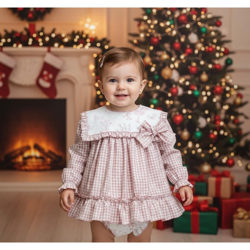 -Conjunto de VALENTINA compuesto por un vestido y ranita en un dulce estampado toile de jouy combinado con vichy en tonos rosas.