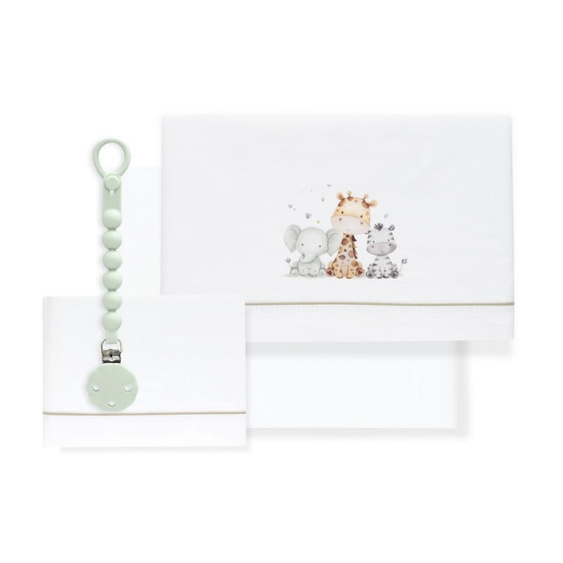 Juego de sabanas para cuna con estampado de animales en tonos verdes y chupetero de silicona en verde.