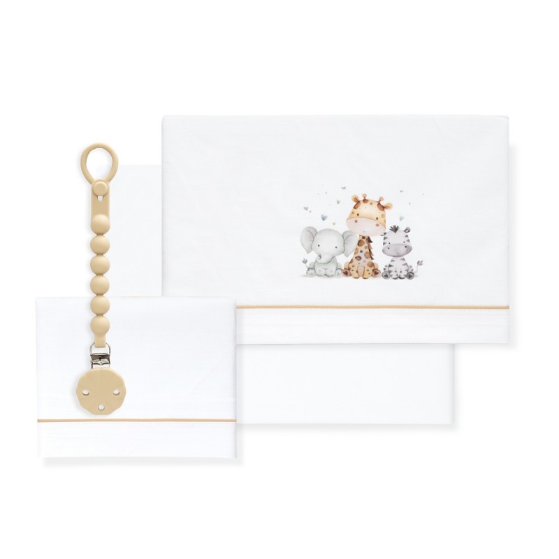 Juego de sabanas para cuna con estampado de animales en tonos beige y chupetero de silicona en beige.