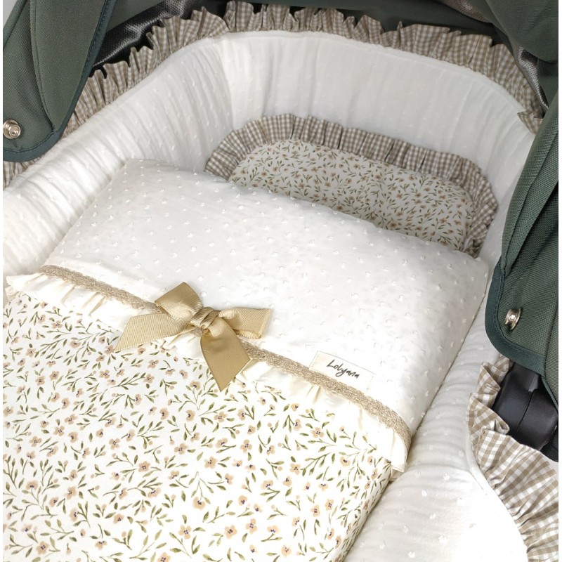 Saco imbox para capazo en algodón de pequeñas flores en tonos verdes y camel.
