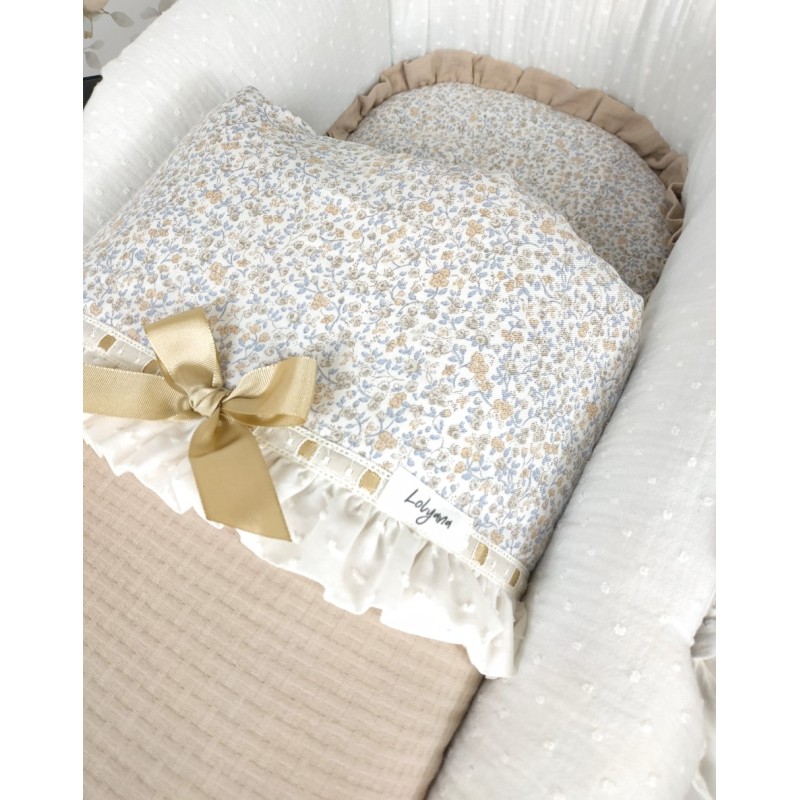 -Colchoneta en viyela estampada Daila con volante en pique camel y una tapa en pique camel combinada con una viyela de pequeñas flores.